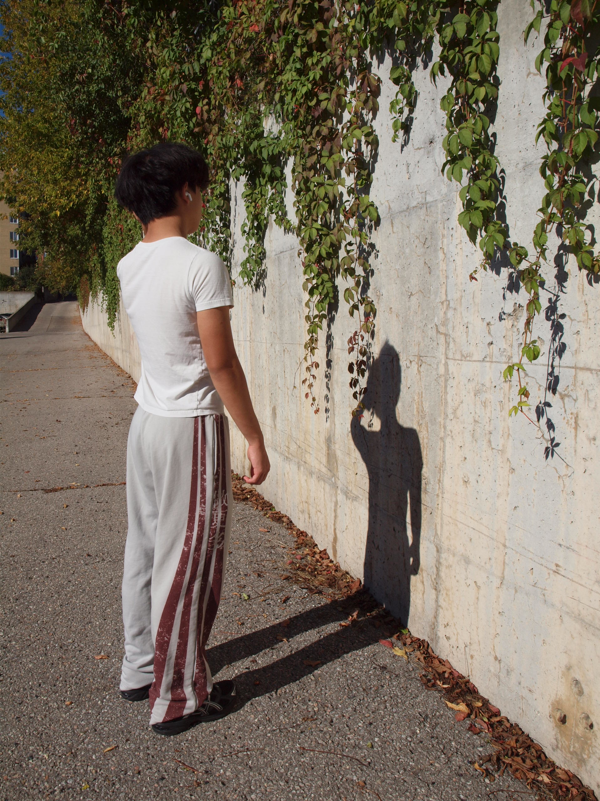 Sweatpants that represent China through traditional stamps and Chinese characters placed on flared stripes.